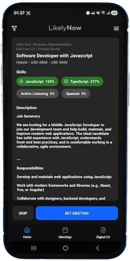 LikelyNow connects you with top jobs or candidates, based on skills. Our algorithm finds the best candidates for jobs, based on their skills, experience, and preferences. It's like having a personal recruiter, but better!